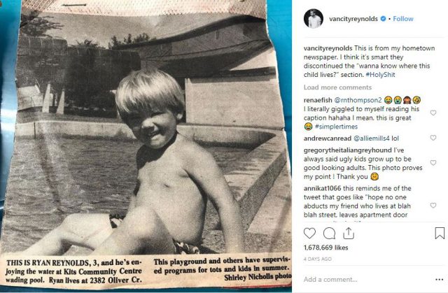Журналисты ванкуверской газеты (если ты забыл, Райан родился в Канаде) однажды сфотографировали трехлетнего Рейнольдса, когда он купался в городском бассейне вместе с родителями. «Это старая вырезка из газеты моего родного города. Я думаю, они поступили благоразумно, когда наконец-то закрыли раздел под названием «Хотите знать, где живёт этот ребёнок?»»