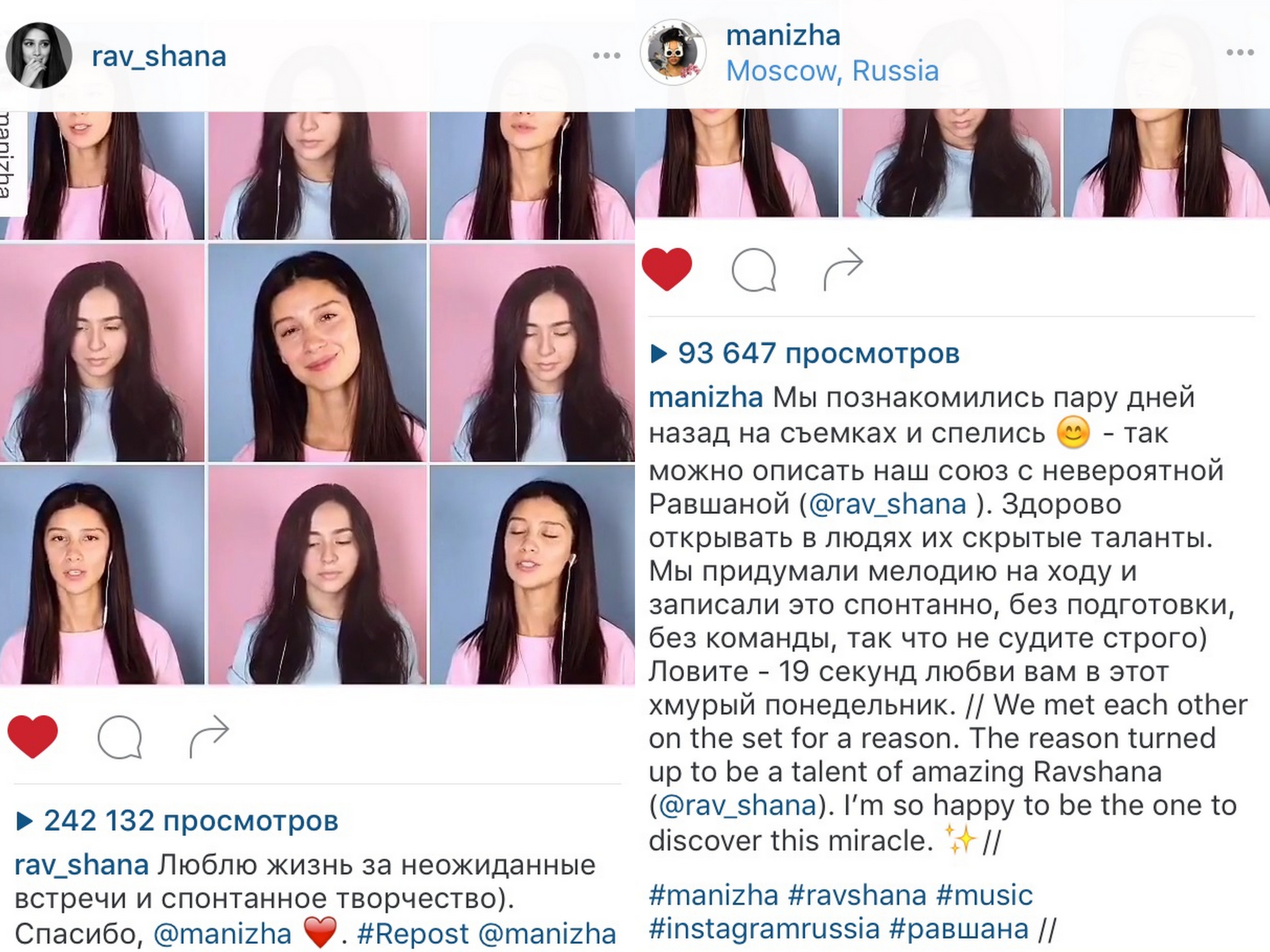 Вчера блогер и музыкант Манижа, известная своим оригинальным профилем в Instagram, выложила небольшое, но симпатичное видео, на котором она и Равшана Куркова вместе исполняют песню.