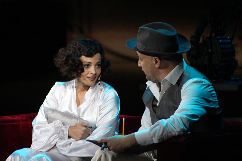Первый акт получился захватывающим и забавным: мы знакомимся с героями Теоны Дольниковой и Гоши Куценко (который сыграл знаменитого режиссера Эрнста Любича), окунаемся в их историю. Девушка всегда была влюблена в Эрнста, а он, хотя и считал ее музой, жил одним кинематографом. Голос Теоны действительно завораживает, а вот Куценко поет по-мужски – не растягивая ноты, зато убедительно и с душой.