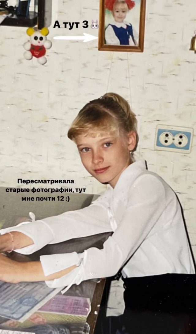 Один из кадров был сделан, когда Алене было 11 лет. Она была запечатлена в школьной форме за рабочим столом. Девушка сидела в белой блузе и черной юбке. На заднем фоне можно увидеть снимок с 3-летней звездой, которая улыбалась в синем платье с красными бантами на волосах.