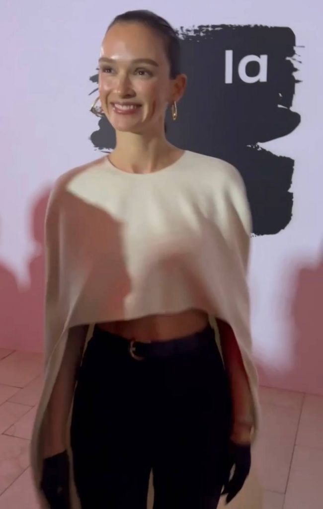 Паулина позировала фотографам с очаровательной искренней улыбкой в длинном белом кейпе, черных брюках и с аккуратной укладкой. Образ дополнили элегантные серьги.
