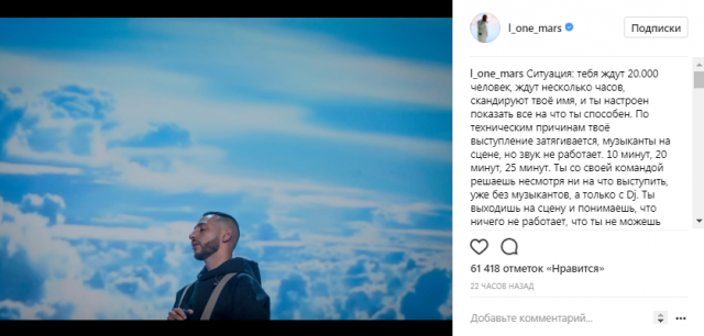 О неприятном инциденте рэпер рассказал на свой страничке в Instagram, Оказывается, в зале были проблемы со звуком: «Ситуация: тебя ждут 20.000 человек, ждут несколько часов, скандируют твоё имя, и ты настроен показать все на что ты способен. По техническим причинам твоё выступление затягивается, музыканты на сцене, но звук не работает. 10 минут, 20 минут, 25 минут. Ты со своей командой решаешь несмотря ни на что выступить, уже без музыкантов, а только с Dj. Ты выходишь на сцену и понимаешь, что ничего не работает, что ты не можешь сделать все, на что ты способен» (здесь и далее орфография и пунктуация автора — Прим.ред.).