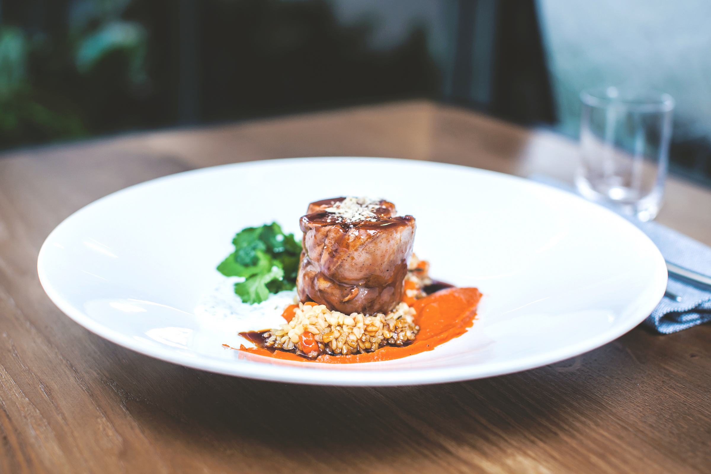 Из горячего обрати внимание на пикантную телячью вырезку с печеной репой, редькой и пюре из красной капусты (850 р.), нежного осьминога с картофелем конфи, соусом ромеско и зеленым луком (950 р.), а также говяжьи ребра с пиперадой и соусом из сладкого красного перца (900 р.).