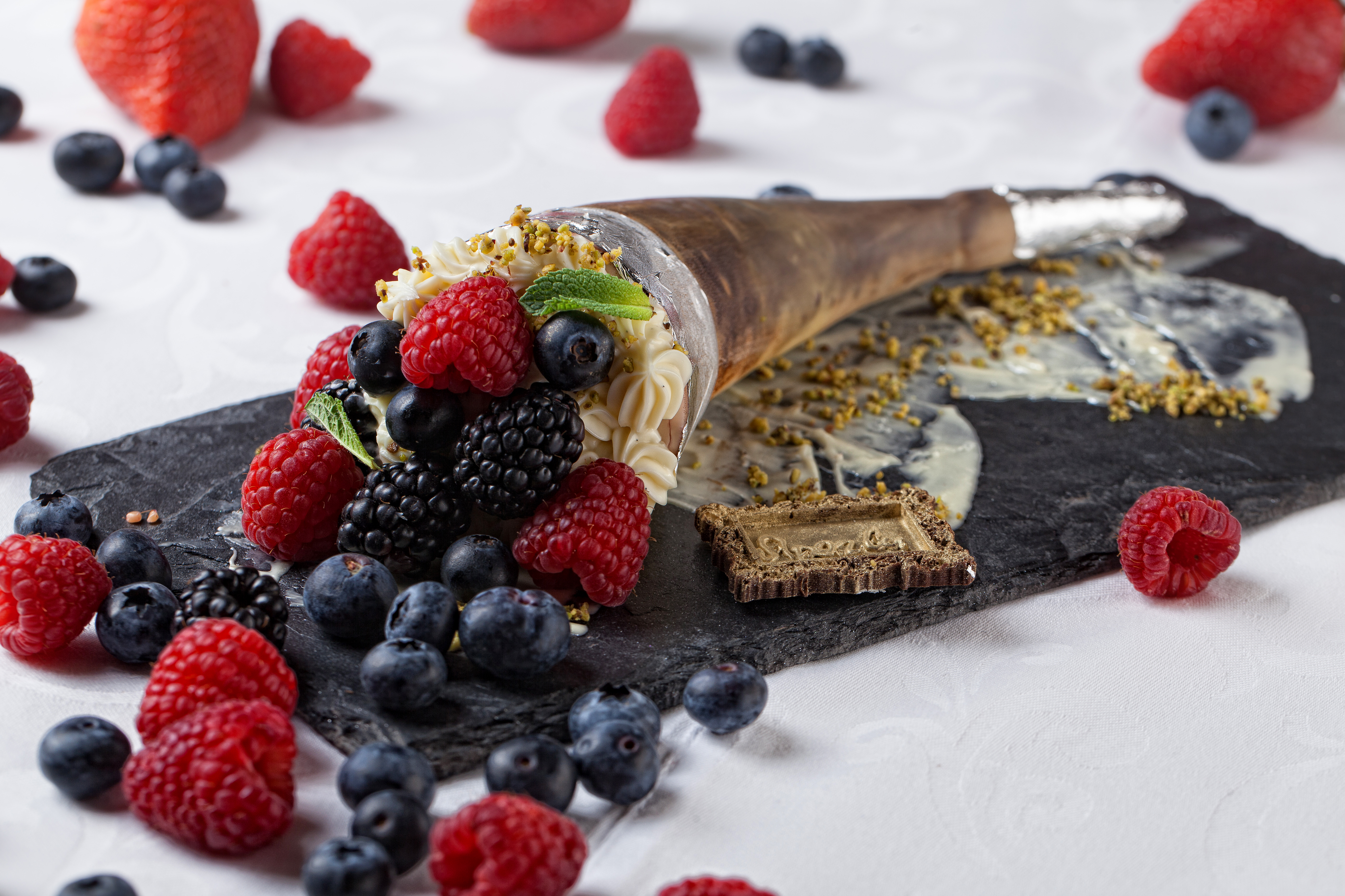 Рог изобилия украшен пищевым серебром, свежими ягодами, а под тонким слоем шоколада кроется суфле.