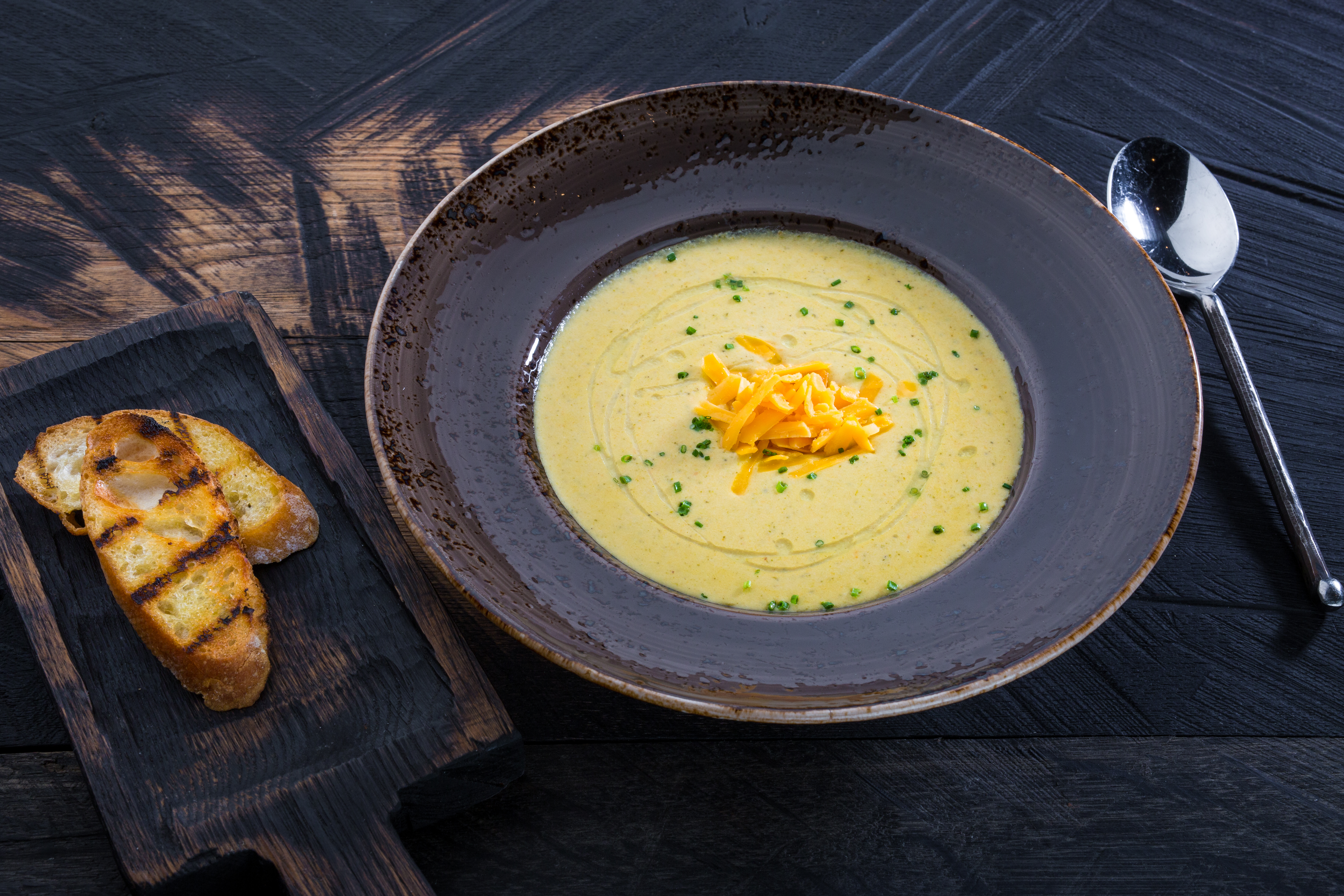 Обязательно стоит попробовать запеченную тыкву с кальмарами (450 р.) и легкий салат с киноа и грибами (390 р.), а также крем-суп с брокколи и сыром чеддер (350 р.).