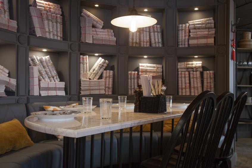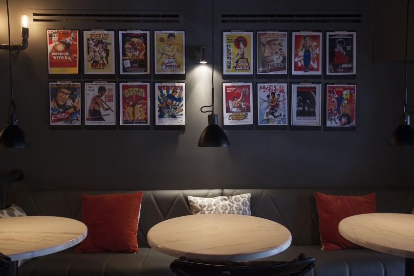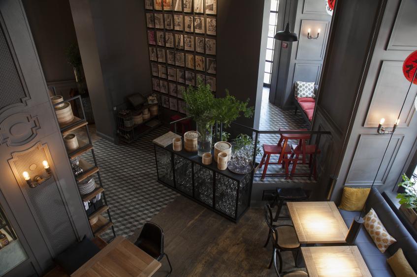Дизайн разработала декоратор Альбина Назимова. От старого интерьера осталось немного. Вместо итальянского убранства теперь полки, заполненные китайскими газетами, вместо торшеров висят яркие бумажные фонарики. А двухэтажная планировка не изменилась: первый этаж вмещает 42 посетителя, второй – 26. Дополняют картину черно-белая плитка, урбанистические элементы декора, китайские постеры на стенах и ярко-красные акценты в деталях.
