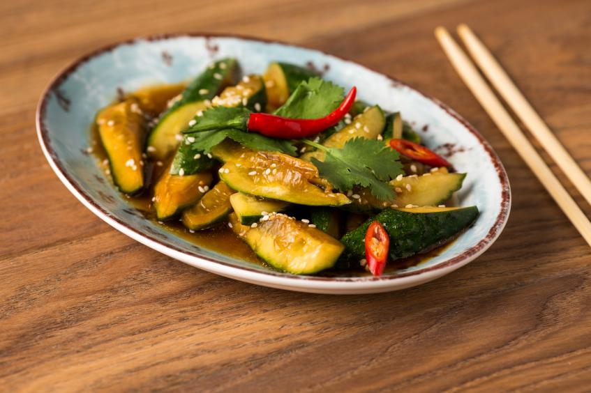 Среди закусок пекинская капуста с соусом ким чи (190 р.), на мой вкус не самая удачная, а также традиционные китайские битые огурцы с сильным привкусом рисового уксуса (200 р.) и китайские пельмени цзяоцзы (60 р. за 1 шт.) из довольно толстого теста.