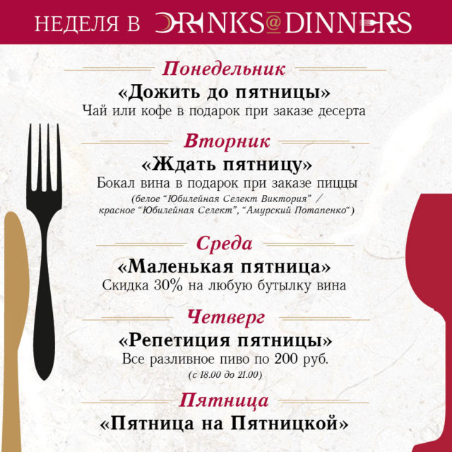 Так, в понедельник гостям предлагается «дожить до пятницы» с чаем-кофе в подарок при заказе десерта. Во вторник «в ожидании пятницы» каждый при заказе пиццы получает в подарок бокал вина. В среду устраивают «Маленькую пятницу» со скидкой 30% на любую бутылку из коллекции вин. В четверг начинается «Репетиция пятницы» – все разливное пиво наливают по 200 р./бокал. А в долгожданную «Пятницу на Пятницкой» начинают отмечать профессиональный праздник, приходящийся на ближайшее воскресенье.
