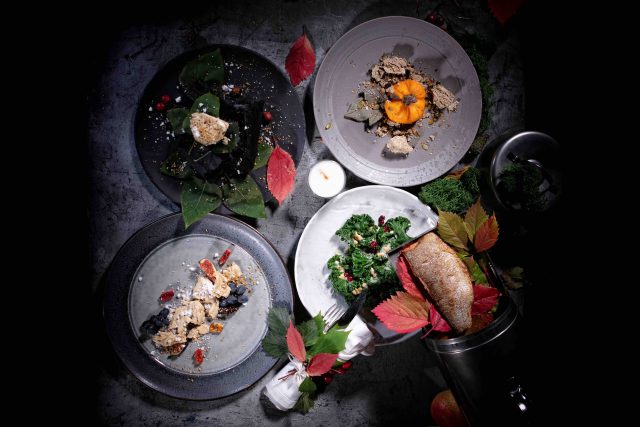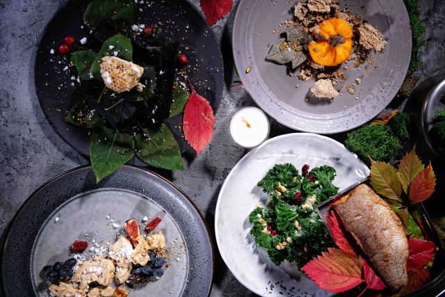 В меню: хрустящая меренга из утиной печени с мармеладными мишками из портвейна, брускетта из сырного мусса в медовых сотах на ледяных углях и сырных камнях, дикая горная форель, копченая в слабом дыме на ольховых опилках и ягоде боярышника, десерт — горящий в абсенте тыквенный сорбе, а еще воздушный шарик из ириски с соленой карамелью.