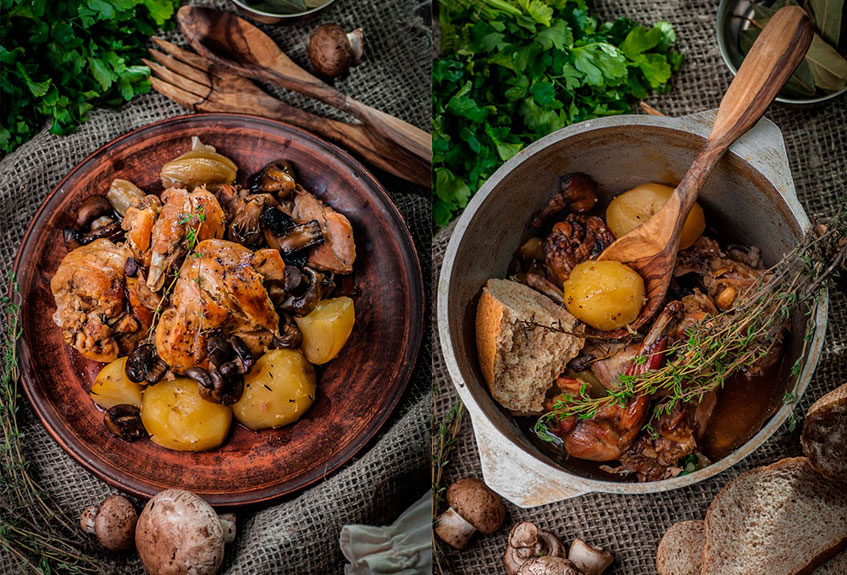 Цыпленка разрежь на четыре части, обжарь в смеси сливочного и растительного масла в кастрюле с толстым дном. Затем вынь мясо, а в кастрюле растопи нарезанное сало. Опусти туда две луковицы, нарезанные грибы и чеснок. Снова положи обжаренного цыпленка, посыпь все мукой, брось тимьян, оставшийся лук, полей коньяком и перемешай. Туши в течение часа, залив красным вином, посоли, поперчи. Затем мясо вынь и держи в теплом месте, а соусу дай выкипеть наполовину. Теперь выложи цыпленка на подогретое блюдо и полей соусом. Готово!