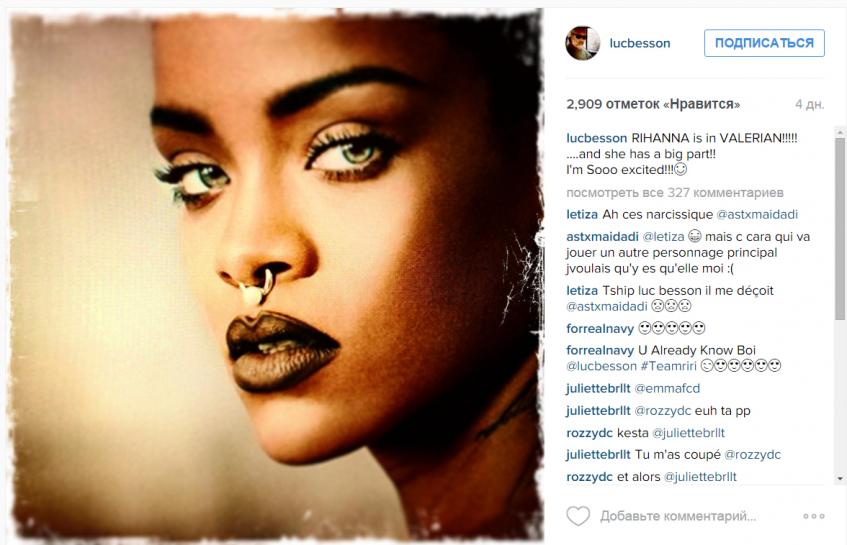 Об этом Люк написал в своем Instagram: «Рианна в «Валериане», и у нее большая роль! Я просто в восторге!»