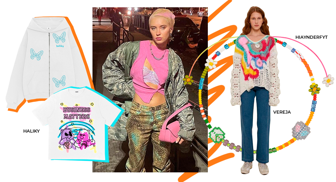 В гардеробе дочери Джуда Лоу Айрис собраны всевозможные винтажные футболки, топы и юбки с яркими и немного наивными принтами. Она обожает «детские» украшения и ни дня не проводит без любимых «игрушечных» сумок. Стиль Айрис — своеобразный микс эстетики нулевых и ностальгии по детству. Поэтому мы решили, что ей понравится молодой московский бренд Haliky, в коллекции которого есть футболки с броскими фразами в духе Business Matters, худи со стразами и кепки, усыпанные лого. Ну и конечно, Vereja Игоря Андреева. А вот из украшений и аксессуаров она бы точно влюбилась в марки Hiaynderfyt и Major Generation.