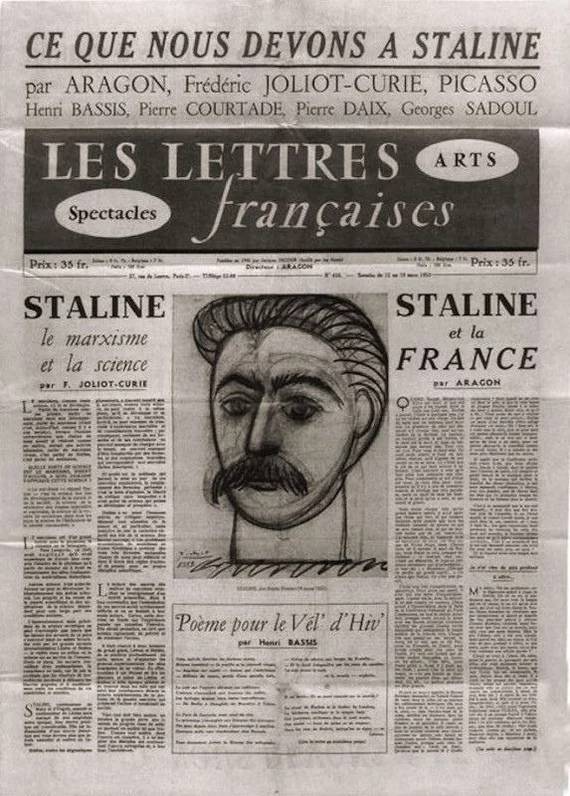 В 1944 году Пабло Пикассо вступил в ряды Французской коммунистической партии. Был убежденным коммунистом и антифашистом до конца собственной жизни. Его политические взгляды вновь связали его в некоторой степени с Россией. После смерти Сталина к Пикассо обратился Луи Арагон с просьбой создать посмертный портрет вождя для французской коммунистической газеты. Однако эксперимент был неудачным: Пикассо выбрал «недостойный карикатурный образ», за что был крайне раскритикован.