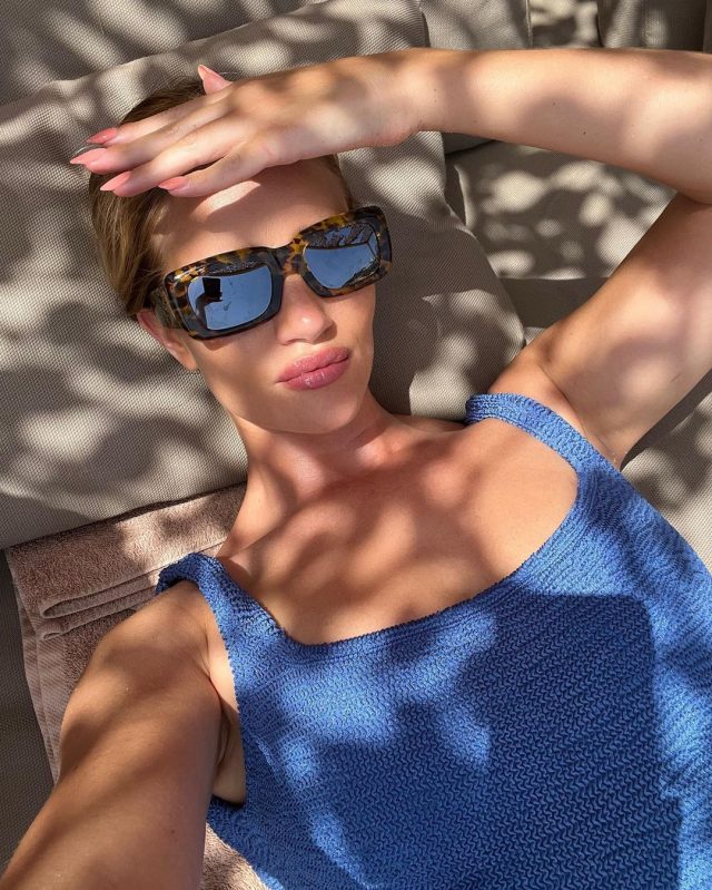 Этим летом Роузи и Джейсон отдыхали на Ибице и на греческом острове Схинусса. В течение отпуска модель постоянно меняла свои образы. Так, например, звезда примерила слитный синий купальник Hunza G и леопардовые очки с голубыми линзами.