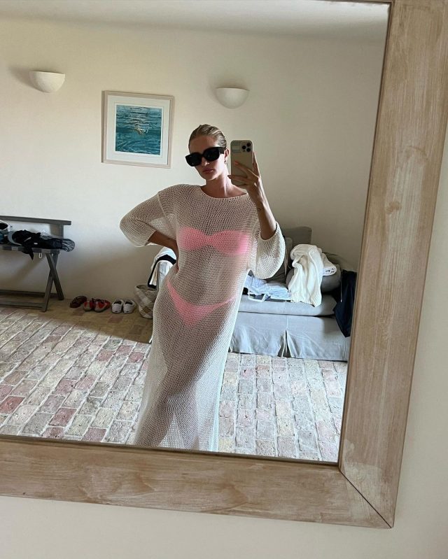 Кроме того, Роузи выгуляла неоново-розовое бикини, которое подчеркнуло ее фигуру. К купальнику она добавила черные очки в массивной оправе и сетчатое белое платье-макси. Не можем не отметить, что модель выглядит просто восхитительно.
