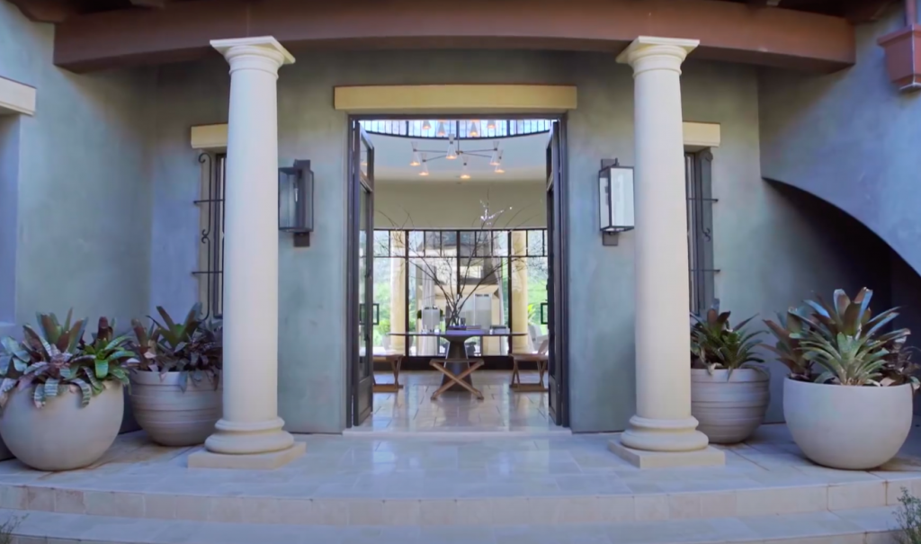 Пространство дома выполнено в средиземноморском стиле с винтажной мебелью и большим количеством зелени. У входа в особняк расположены две массивные колонны, прихожая украшена большим бетонным столом, сделанным на заказ, а пол выложен кремовыми известняковыми плитками.