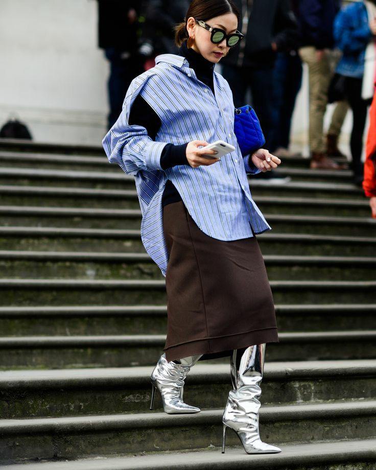 Теперь определяемся с обувью. Длинные юбки или модели миди лучше всего носить с высокими сапогами. Ещё один вариант: Челси на платформе. Кстати, один из главных трендов сезона.