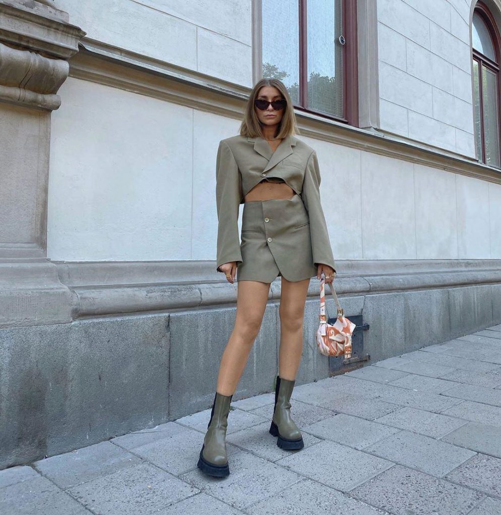 Укороченный пиджак идеально подойдёт для юбки-блейзера. Дополнить образ можно капроновыми гольфами и грубыми ботинками.