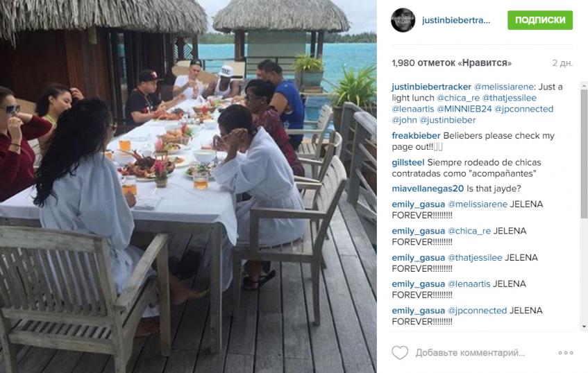 Пару дней назад в Instagram певца и модели начали появляться фотографии с видами сказочного острова Бора-Бора. Однако они не спешили показывать поклонникам, что отдыхают вместе. Несмотря на это, фанатам все же удалось найти фото, на котором ребята запечатлены за одним столом.