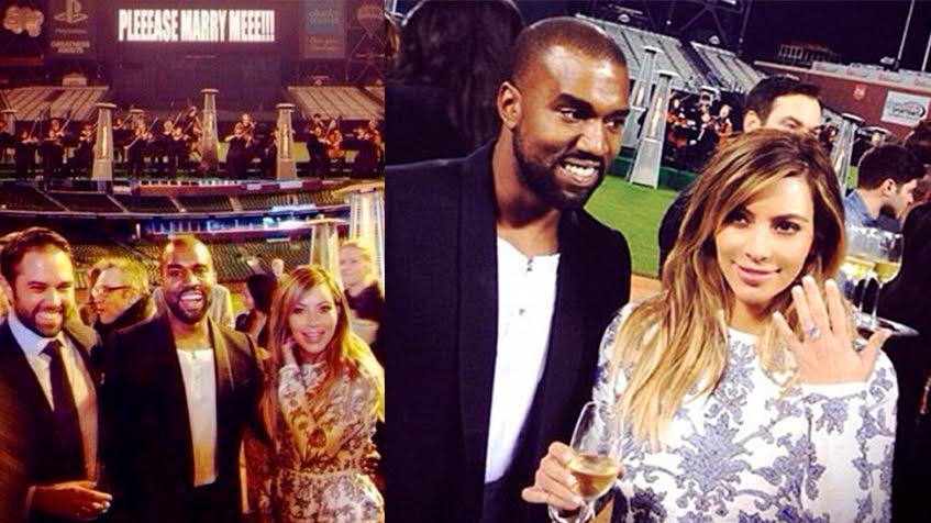 Рэпер Канье Уэст (38) сделал предложение Ким Кардашьян (34) с настоящим размахом. Чтобы удивить свою возлюбленную, он арендовал целый стадион в Сан-Франциско и в день рождения Ким под аккомпанемент симфонического оркестра, который исполнял композицию Уэста Knock Me Down, преподнес возлюбленной бриллиантовое кольцо с ослепительным 15-каратным камнем. В это время на большом табло загорелась надпись: PLEEEASE MARRY Meeee !!! Как только телезвезда сказала заветное да, небо осветили миллионы фейерверков. За этим действом наблюдали самые близкие люди супругов.