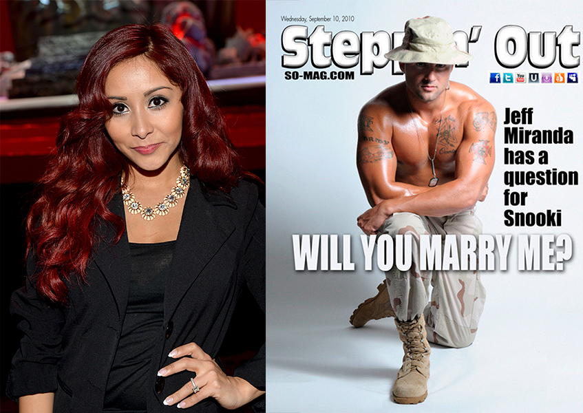 Фантазии Джеффу Миранде явно не занимать! После двух недель знакомства влюбленный мужчина сделал актрисе Снуки (27) предложение. И не просто так, а с обложки глянцевого журнала, где он предстал опустившись на одно колено с обнаженным торсом, а надпись говорила сама за себя «Ты выйдешь за меня?». Но девушку столь необычный поступок не тронул, и она ответила отказом.