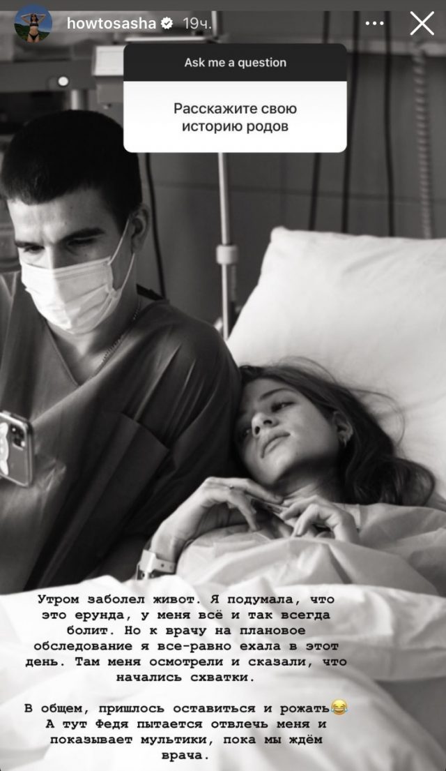 В марте этого года музыкант Федук и Саша Новикова стали родителями. У пары родилась дочка Нина. Саша активно ведет социальные сети: делится здоровыми привычками, личными историями и семейными фотографиями. Сегодня подписчикам удалось узнать, как дочь известного ресторатора Аркадия Новикова перенесла роды. «Утром заболел живот. Я подумала, что это ерунда, у меня все и так всегда болит. Но к врачу на плановое обследование я все равно ехала в это день. Там меня осмотрели и сказали, что начались схватки. В общем, пришлось оставаться и рожать».