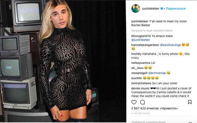 «Вам надо познакомиться с моей сестрой Рейчел Бибер», — написал Джастин. Шутки за 300.