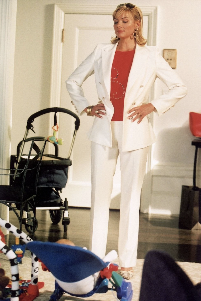 Без тени сомнения: Саманта Джонс – power woman. Причем не только из-за почетного звания владелицы PR-агенства – ее характер и сила духа отправят в нокаут любого. Оттого героиня питала особую любовь к жакетам и брючным костюмам Mugler с массивной и четкой линией плеча, а также с акцентом на талии. Проще говоря – к однозначным синонимам власти. Можно даже подчеркнуть, что ее гардероб стал одной из предпосылок тренда на тихую роскошь. Задолго до 2023-го, но все же.