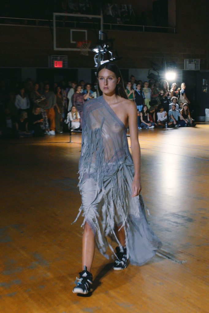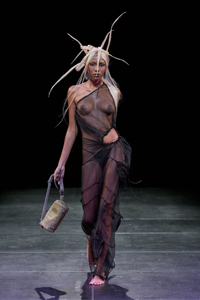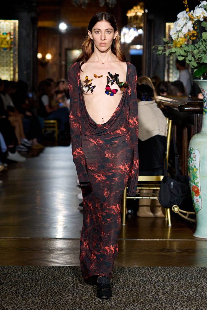 К примеру, Дион Ли акцентирует наше внимание на всевозможных вырезах и анатомии тела. В коллекции бруклинского бренда Fe Noel много полупрозрачной ткани, из которой сделаны топы и юбки, а на показе Collina Strada модель появилась в нежно-розовом платье, которое крепилось к ее соскам. Ну и как не отметить первый образ на шоу Puppets and Puppets – платье с экстремальным декольте, оголившем грудь и десяток бабочек вместо бра.