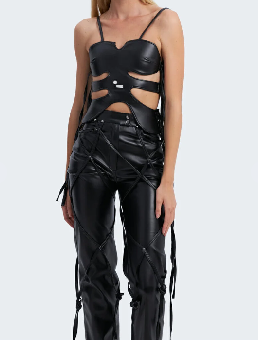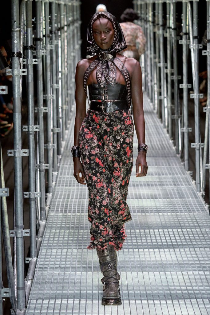 Эксплуатирующая сексуальность в том или иной виде появлялась на показах Mowalola, Ambush, Dion Lee, Richard Quinn и Ferrari. А атрибуты доминатрикс – кожаные корсеты, латексные перчатки и высоченные каблуки на платформе – плотно закрепились на пьедестале главных трендов.