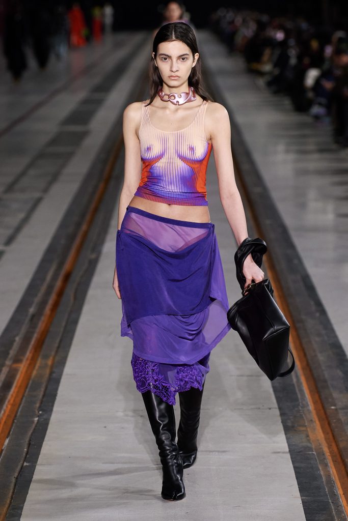 Если в прошлом десятилетии дизайнеры всячески пытались одеть людей (об этом говорит и пресловутый оверсайз, и тренд на многослойность, и эстетика «бежевого» блогера), то сейчас все с точностью да наоборот. Бал правит эпатаж, секс и бунтарство. А среди главных «приглашённых», конечно же, Джулия Фокс.