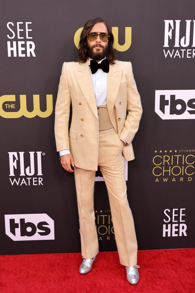 Джаред Лето был достаточно скромным в этот раз и надел костюм с острыми плечами бежевого цвета и серебристыми туфлями.
