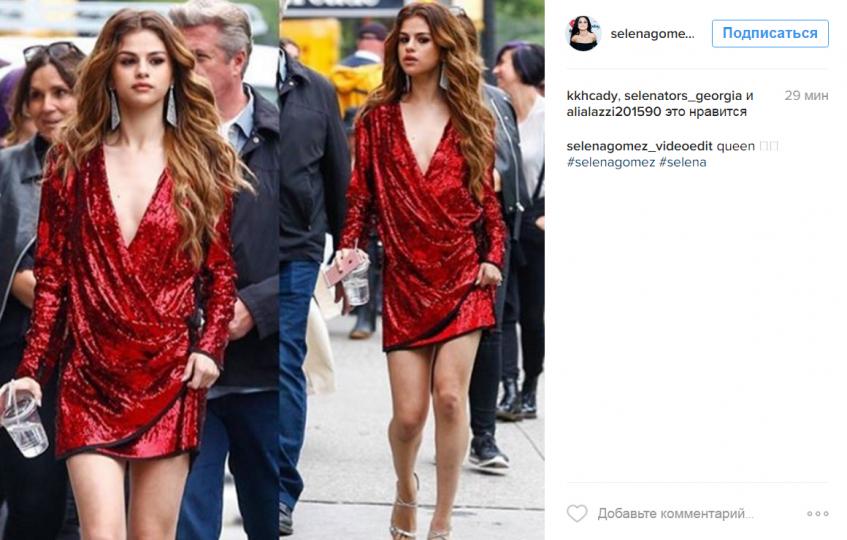 Красный — точно цвет Селены. И она это доказала, примерив сначала пикантное короткое блестящее платье с глубоким вырезом, дополнив его огромными блестящими серьгами. А всего через несколько минут звезда появилась на съемочной площадке в длинном шелковом алом наряде с открытыми плечами и босоножках на высоком каблуке.