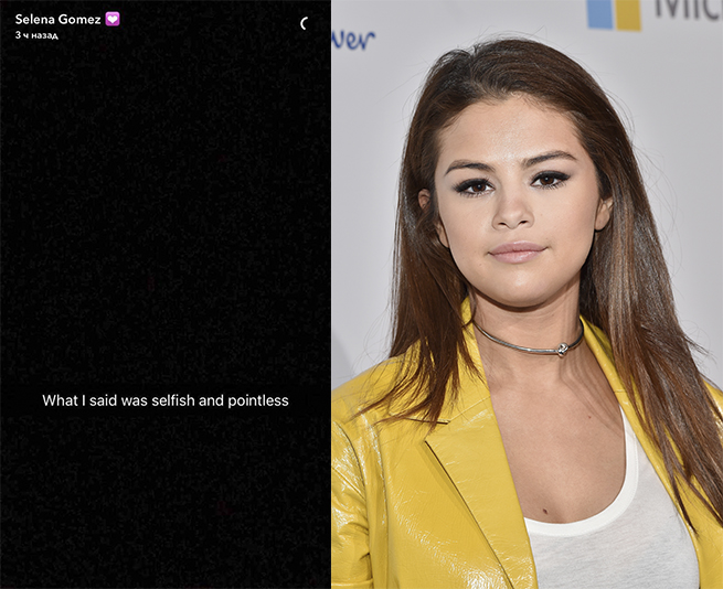 Селена не могла не отреагировать на выходку Бибера. Она написала в своем Snapchat: «То, что я сказала, было эгоистичным и бессмысленным».
