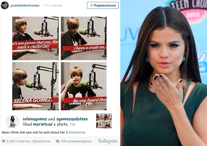 Певица лайкнула фото с экс-возлюбленным. Правда, снимок опубликован на фанатской странице в Instagram. На фото ты можешь видеть скриншот старого интервью музыканта, где Джастин признается, что сходит с ума по Селене.
