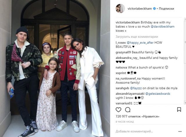 И, конечно, свой 44-й день рождения дизайнер сегодня встретила в кругу детей. В своем Instagram Вики поделилась новой фотографией с Ромео (15), Крузом (13), Бруклином (19) и Харпер (6) и написала: «День рождения с моими малышами. Очень люблю @davidbeckham. Целую».