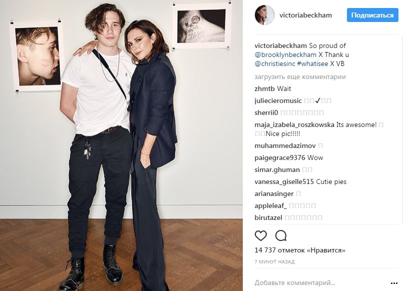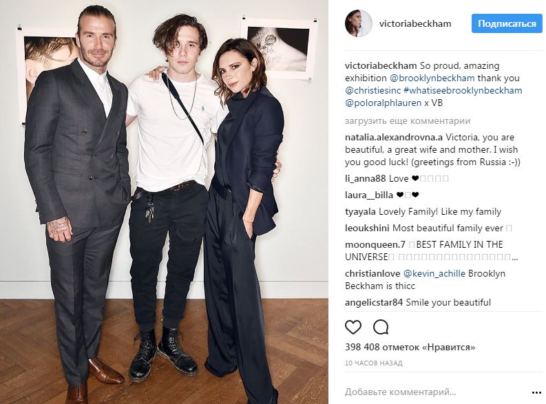 На выставку пришли и родители Бруклина. «Горжусь! Потрясающая выставка», — написала у себя в Instagram Виктория.