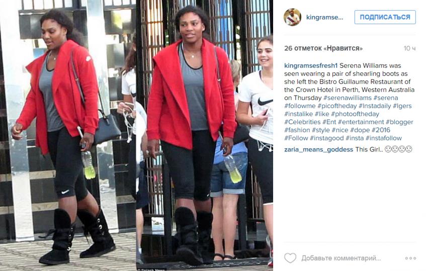 7 декабря папарацци застали Серену, выходящей из одного из ресторанов города Перт (Австралия) в удивительном виде: спортсменка появилась в черных спортивных леггинсах, майке, красной кофте и черных высоких сапогах, которые сильно выбивались на фоне ее остального гардероба.