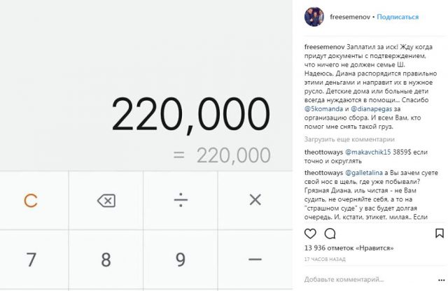 «Заплатил за иск! Жду когда придут документы с подтверждением, что ничего не должен семье Ш. Надеюсь, Диана распорядится правильно этими деньгами и направит их в нужное русло. Детские дома или больные дети всегда нуждаются в помощи… Спасибо Павлу Пятницкому и Диане Пегас за организацию сбора. И всем вам, кто помог мне снять такой груз», — написал Семенов в своем Instagram.