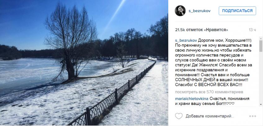 И сделал это актер в духе времени — через Instagram. В соцсети Сергей опубликовал фото весеннего пейзажа, под которым написал: «Дорогие мои, хорошие!!!!!) По-прежнему не хочу вмешательства в свою личную жизнь, но, чтобы избежать огромного количества пересудов и слухов, сообщаю вам о своем новом статусе! Да! Женился! Спасибо всем за искренние поздравления и понимание!!! Счастья вам и побольше СОЛНЕЧНЫХ ДНЕЙ в вашей жизни!!! Спасибо! С ВЕСНОЙ ВСЕХ ВАС!!!!»