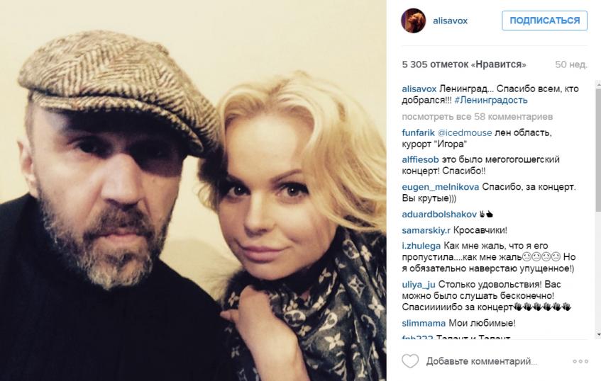 Как оказалось, первой на немирное расставание намекнула супруга фронтмена и одного из основателей «Ленинграда» Сергея Шнурова (42) Матильда. Она написала фактически прямое обращение к бывшей вокалистке группы: «Алиса, удивительно, что не было спасибо ни за «Ледовый», где 12 тысяч зрителей на тебя смотрело, ни за московские концерты с полным аншлагом. У тебя тут большая часть подписчиков — поклонники группы «Ленинград».