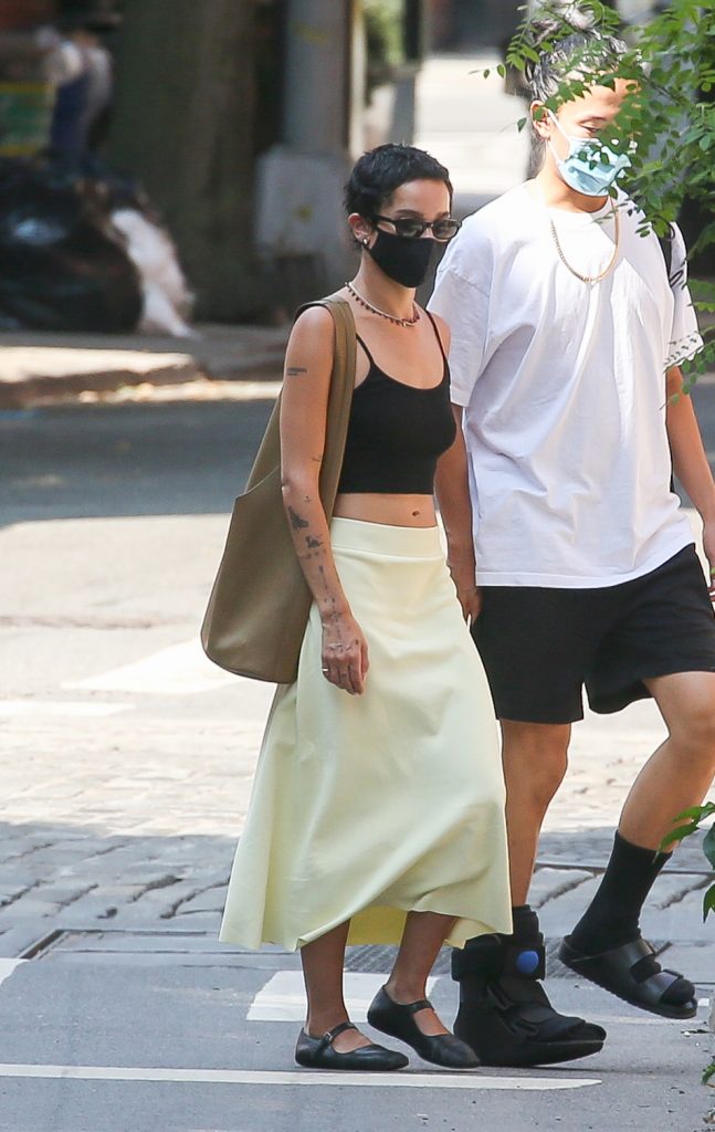 Никто не носит юбки миди лучше, чем Зои. Она появляется в них и на прогулках с бойфрендом, и на красных дорожках. Как правило, звезда выбирает модели на низкой талии и сочетает их с базовыми топами, оверсайз футболками и вьетнамками.