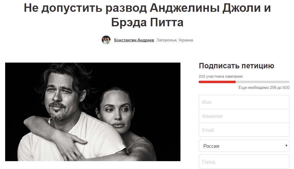 Главная повестка дня – развод Анджелины Джоли (41) и Брэда Питта (52). Пока они решают свои проблемы в Лос-Анджелесе, на Украине, в городе Запорожье, нашелся человек, который ну очень не хочет, чтобы актеры разводились. Настолько не хочет, что решился на крайние меры: создал петицию на change.org. Называется она «Не допустить развод Анджелины Джоли и Брэда Питта».