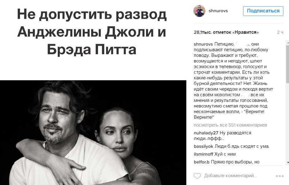Такое событие не смог оставить без внимания Сергей Шнуров (43). Он опубликовал в Instagram снимок Брэда и Анджелины и подписал: «Петицию, они подписывают петицию по любому поводу. Выражают и требуют, возмущаются и негодуют, шлют эсэмэски в телевизор, голосуют и строчат комментарии. Есть ли хоть какие-нибудь результаты у этой бурной деятельности? Нет».