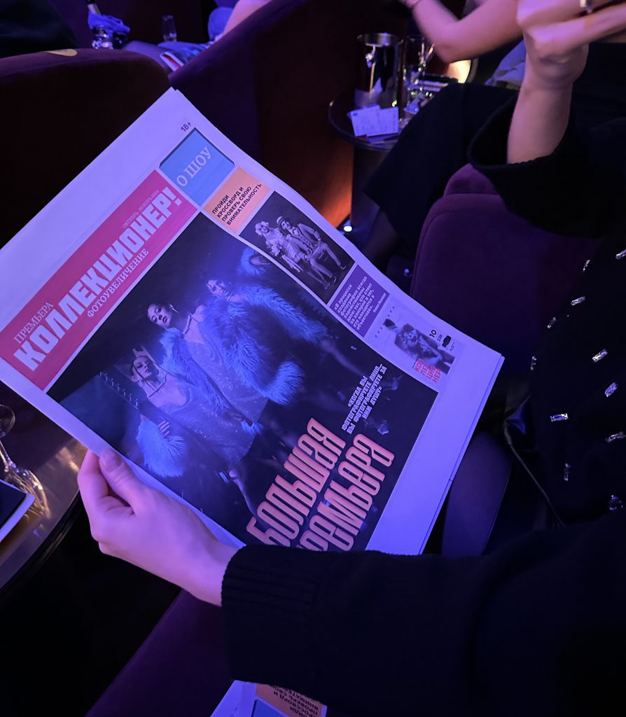 И вот, когда ты уже сыт и расслаблен, пришло время для просмотра шоу. Да, все это находится в «Ленинград Центре»: чтобы попасть на эмоциональный аттракцион, этакий театр-коллаж, где сюжет строится из звуковых, визуальных и пластических ассоциаций, тебе нужно всего лишь спуститься на пару этажей вниз. В этом году «Ленинград Центр» празднует свое десятилетие, в честь которого представляет шоу «Коллекционер. Фотоувеличение». Не успела я удобно расположиться на мягком диване, как мне принесли бокал игристого и конфеты, свет погас, зал замер, шоу началось!