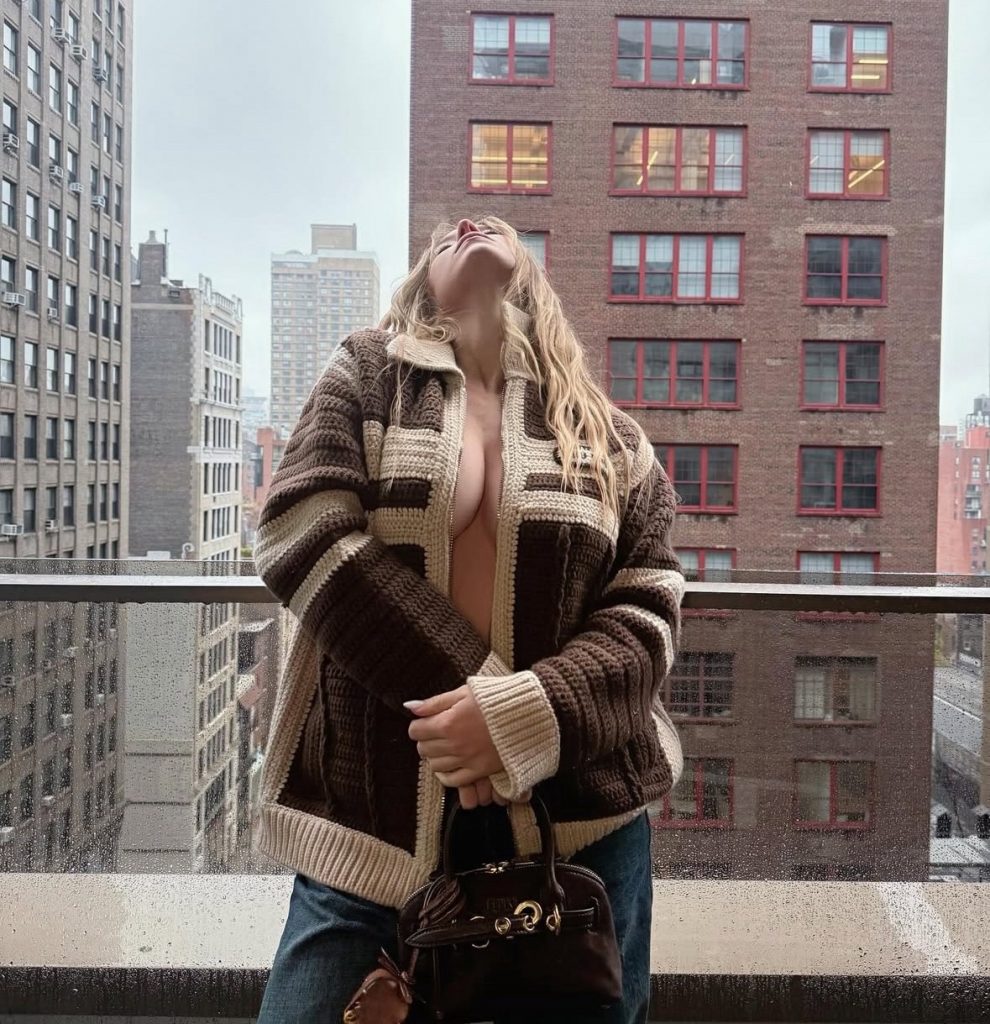 Актриса «Эйфории» опубликовала в запрещенной социальной сети откровенные фото. На кадрах Сидни позирует в вязаной кофте на голое тело.