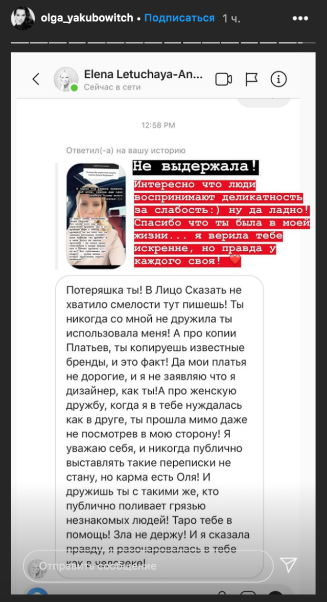 «Ты никогда со мной не дружила, ты использовала меня! А про копии платьев, ты копируешь известные бренды, и это факт!» — написала Летучая в ответ на обвинения.