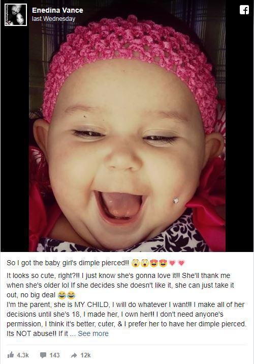 Мать шестерых детей Энедина Ванс выложила на своей странице в Facebook фото, которое просто шокировало ее подписчиков. На снимке – ее годовалая дочь Белла Луна с пирсингом в щеке.