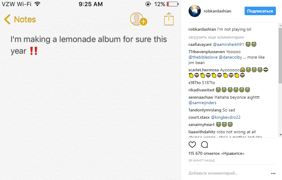 Потом Роб и вовсе заявил: он надеется, что однажды его малышка Дрим увидит это все. «Я хочу, чтобы она знала — это не Любовь. Я не хочу, чтобы мою дочь воспитывала такая мать как Чайна, которая принимает наркотики, пьёт и водит мужиков в тот дом, где находится мой ребёнок». А под конец Роб пообещал: он точно запишет альбом Lemonade в этом году (как Бейонсе — расскажет о проблемах в отношениях в песнях).