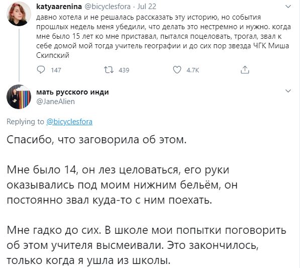 Теперь же о скандале говорят все. Так, например, об отношениях с Михаилом «Медузе» анонимно рассказала девушка, которая встречалась с ним, когда ей было 16 (они познакомились на Чемпионате России по ЧГК в 2009 году): «Это было по обоюдному согласию. На тот момент мне нравилось, что такой клевый чувак обратил на меня внимание». Девушка заявила, что знала, что Скипский занимался сексом и с другими девушками. Кроме того, уже тогда он был женат (Надежда Скипская, если верить слухам в Сети, неоднократно ловила супруга на изменах).
